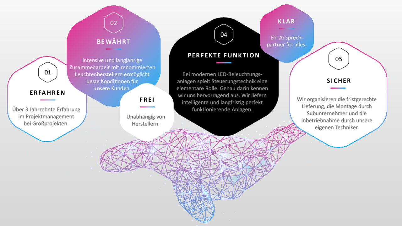Durch unser kompetentes Partnernetzwerk (auch aus der Leuchtenbranche mit Standard-Leuchtenherstellern und Sonderleuchtenbauern) sowie die enge Zusammenarbeit mit Lichtplanern und Lichtdesignern, haben wir die Möglichkeit, unseren Kunden auch Gesamtpakete zu schnüren und so für eine reibungslose Umsetzung zu sorgen. Damit bekommen Sie mit uns den einen zentralen Ansprechpartner: wir kümmern uns dann darum, dass die Anlage lichttechnisch und steuerungstechnisch wirklich so funktioniert wie vorgesehen.