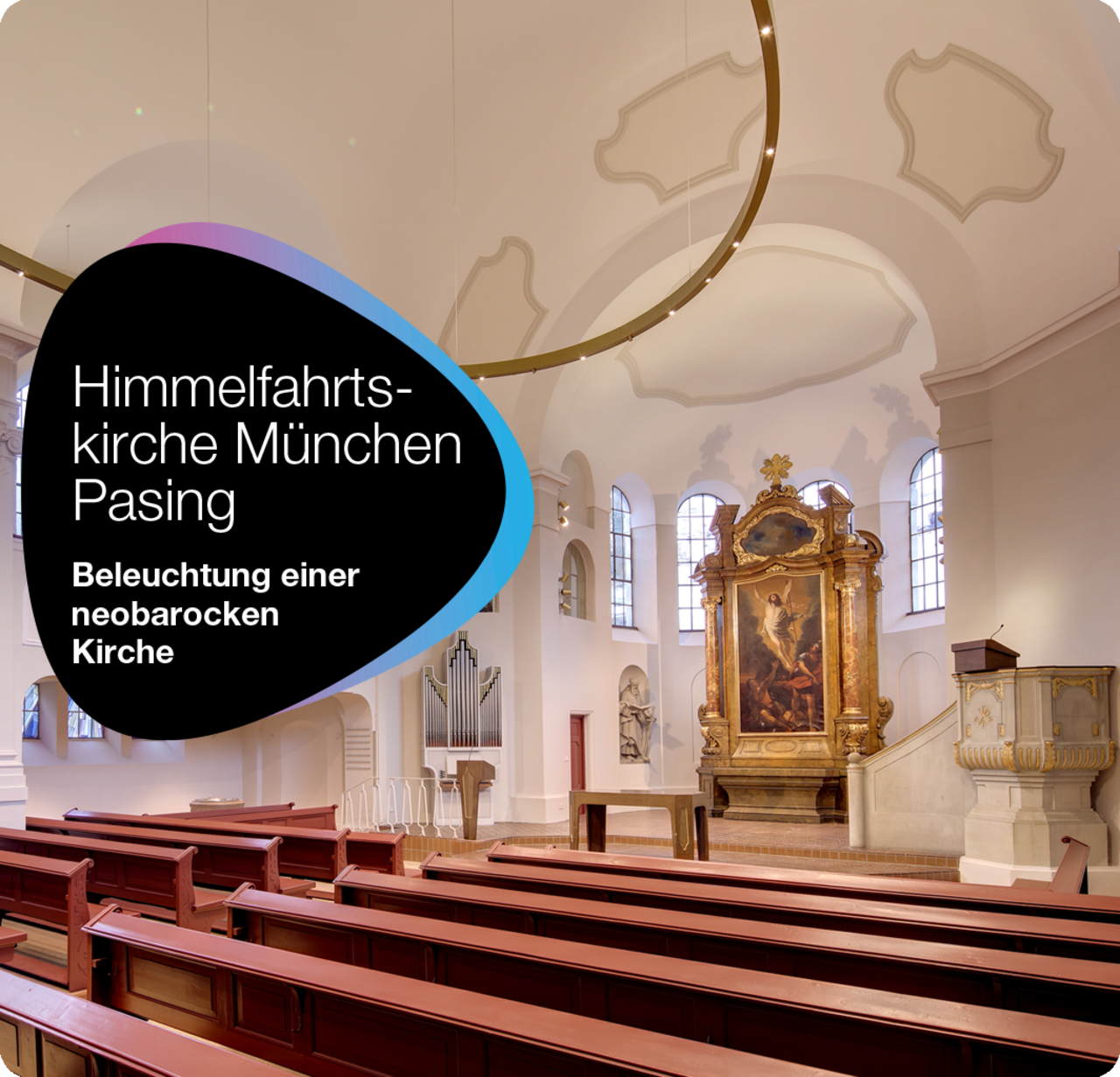 The renovated interior of the Himmelfahrtskirche Pasing is kept in muted shades of white and grey and shines with a new lighting system: an oval ring light measuring a good 6 x 9 metres hangs in the centre of the church nave. The brass colouring picks up on the gold trim on the altar, pulpit and organ. The profile of the ring light is equipped with small reflectors with energy-efficient and dimmable LED modules. Linear LED profiles are arranged as uplights to illuminate the vault. They can be dimmed separately from the reflectors so that different lighting moods can be created in the church interior. The altar area is illuminated with integrated, swivelling spotlights, the high altar with directional spotlights at the side of the choir arch. The surrounding galleries are illuminated with slim pendant luminaires. The areas below the galleries are lit with ceiling luminaires.