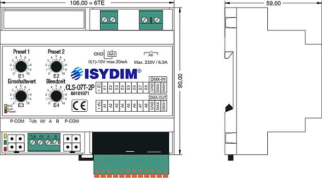 The CLS-07T-2P is a convenient solution for lighting controls with standardised 0(1)-10V interface for source and sink operation. The interface can be loaded with 20mA and is used for direct connection of dimmable fluorescent lamps with ECG 1-10V or LV halogen lamps with 1-10V transformer. A hybrid relay switching output with a load capacity of 230V, 1500VA, 6.5A is also available for the analog output. This is optimised for ECG loads by a special zero-crossing circuit and guarantees a safe mains circuit for dimming. By using additional power dimmers, a wide variety of applications and power classes can be realised. The basis of the control unit is a digital, future-oriented multiprocessor technology, which guarantees easy to operate functions and extremely safe operation.