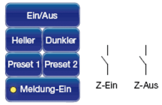 Up to 7 buttons/contacts (24V) and 3 feedback signals (24V) can be connected to the control unit. 4 potentiometers are available for setting the "switch-on light value" (Einschaltwert), value "Preset 1" and "Preset 2" and the "fade time" (Blendzeit).