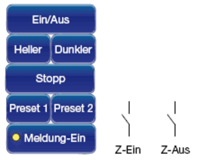 Up to 8 buttons/contacts (24V) and 5 feedback signals (24V) can be connected to the control unit. 4 potentiometers are available for setting the "switch-on light value" (Einschaltwert), value "Preset 1" and "Preset 2" and the "fade time" (Blendzeit).