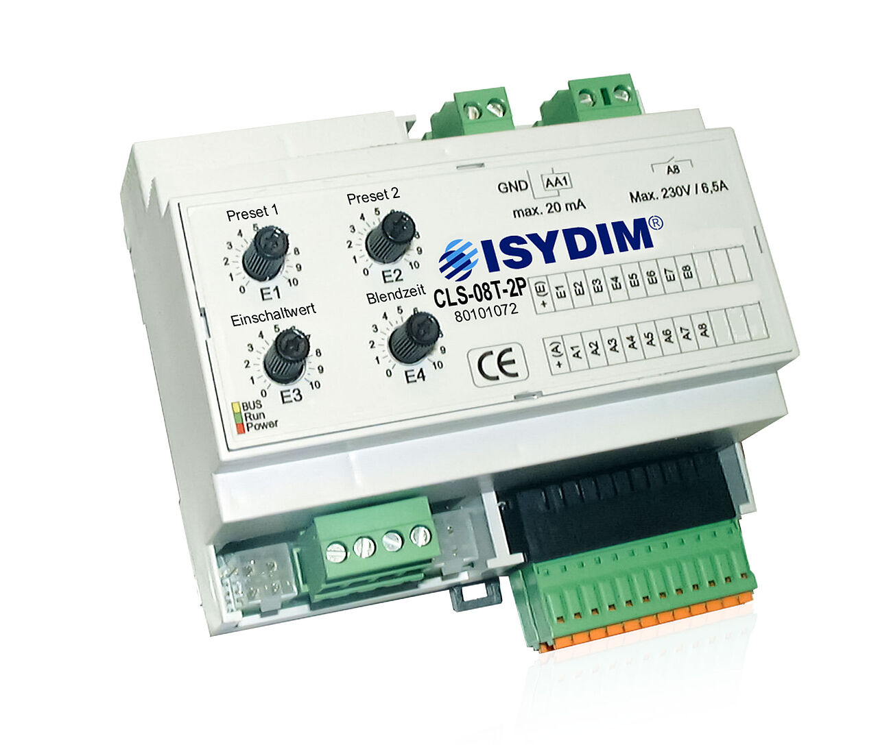 The CLS-08T-2P Light Control Unit is a convenient solution for lighting controls with standardised 0(1)-10V interface for source and sink operation. The interface can be loaded with 20mA and is used for direct connection of dimmable fluorescent lamps with ECG 1-10V or LV halogen lamps with 1-10V transformer. A hybrid relay switching output with a load capacity of 230V, 1500VA, 6.5A is also available for the analog output. This is optimised for ECG loads by a special zero-crossing circuit and guarantees a safe mains circuit for dimming. By using additional power dimmers, a wide variety of applications and power classes can be realised. The basis of the control unit is a digital, future-oriented multiprocessor technology, which guarantees easy to operate functions and extremely safe operation.