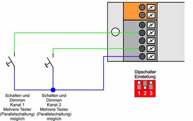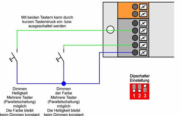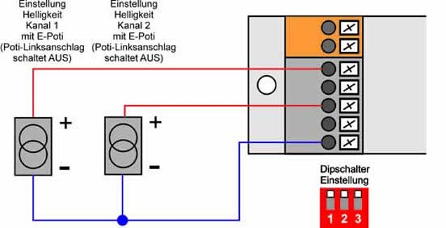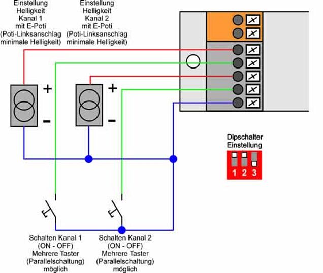 In this mode the brightness of the channels can be adjusted with a 1-10V potentiometer each. Switching on/off is realized by one pushbutton each. If several control points in the room are required, additional pushbuttons can be connected in parallel.