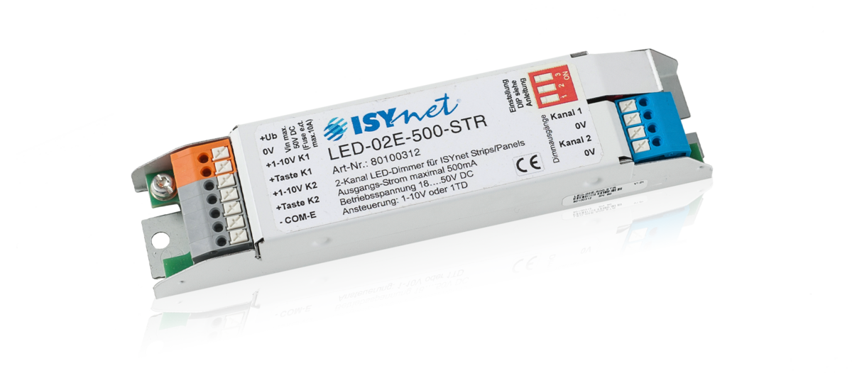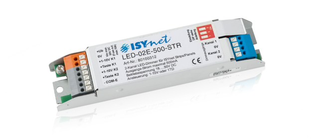 The 2-channel LED Dimmer was developed for powerless dimmable LEDs and LED lamps. Here 2 PM outputs with a respective load capacity of up to 500mA are available. The control functions focus on stand-alone applications. 6 different operating modes can be set.