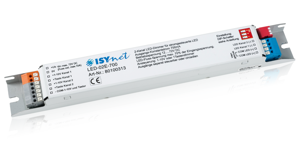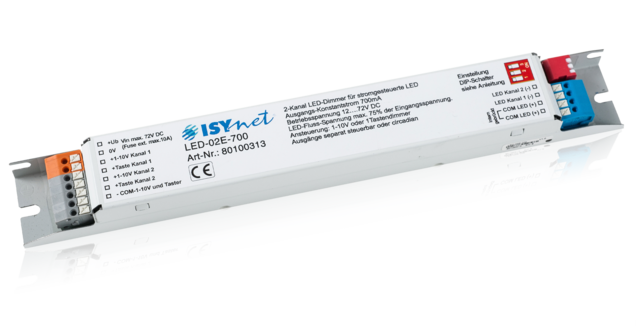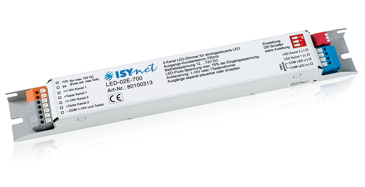 The 2-channel LED Dimmer was developed for Power-LEDs and LED lamps which are operated with 700mA constant current. The control functions focus on stand-alone applications. 6 different operating modes can be set.