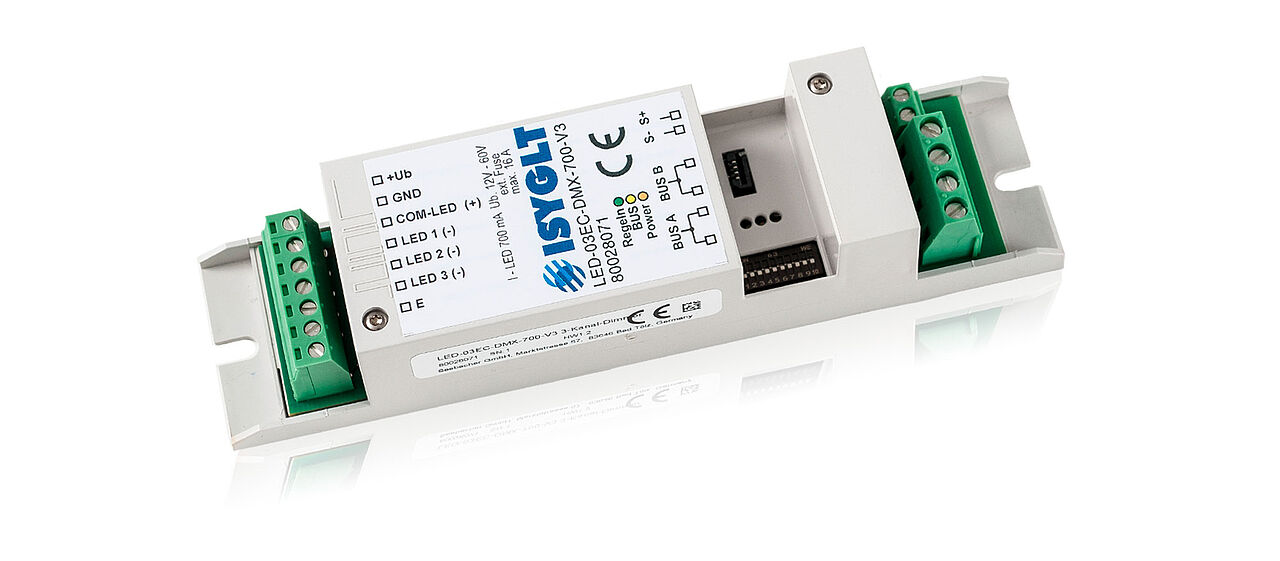 | LED-03EC-DMX-700-V2 Art. no. 80028070, 3-channel LED dimmer for power LED (700mA) with colourfast dimming, with housing, for very noise-sensitive applications |