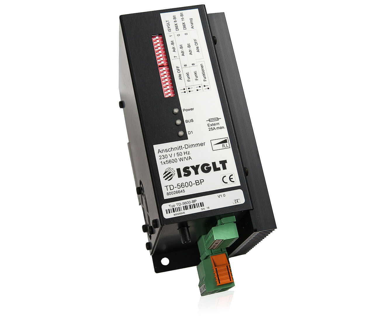 The thyristor dimmer is a classic leading edge dimmer in 16-Bit "Thyristor Antiparallel Technology". This type of control is certainly the upper class of dimmers and cannot be compared to the simpler triac dimmers. The control and monitoring for each half-wave is carried out separately here, since a thyristor is available and responsible accordingly. The dimmer is characterised by its extreme robustness in the respective power class. In leading edge control technology, all ohmic loads (incandescent lamps, high-voltage halogen lamps, heaters) and inductive loads (halogen with magnetic transformers, fluorescent lamps with VIP-90, motors, plastic welding equipment with magnetic transformers) can be operated. The dimmer has several control modes and can be operated conventionally with internal or external potentiometer, button, 0-10V, 1-10V or 0-55µA signal or digitally in ISYGLT-BUS, DMX512 8-Bit or DMX512 16-Bit. The basic function parameters are set via 2 DIP switches; detailed parameters can only be set in the ISYGLT system. The function of the potentiometer for BUS, stand-alone or DMX operation is parameterised by us at the factory, please let us know when ordering which function it should have. All functions can also be parameterised via an ISYGLT Master Module with the ProgramDesigner.