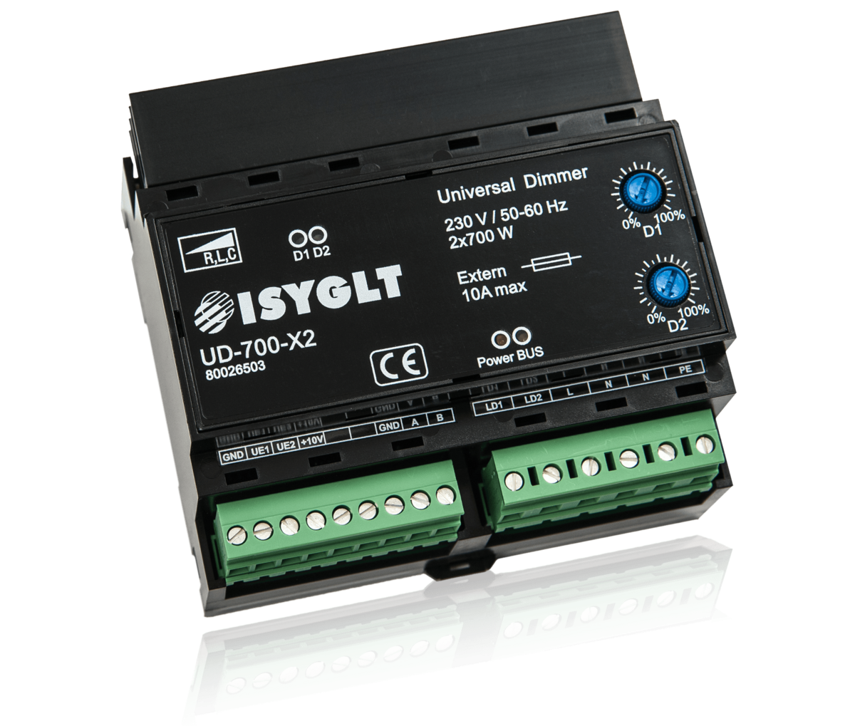 | Single-button dimmer | Control via standard buttons on terminals UE1 and UE2 against GND Press briefly = on/off, press longer = dim |