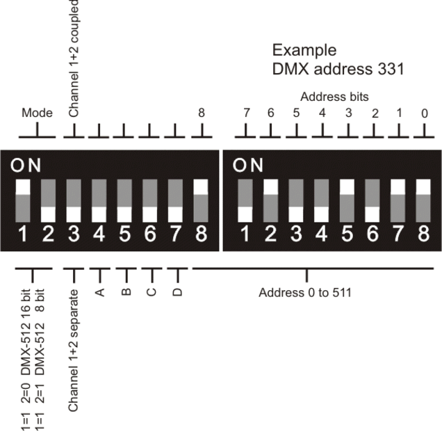 A/B/C/D DIP switches - operating mode setting for DALI and stand-alone operation