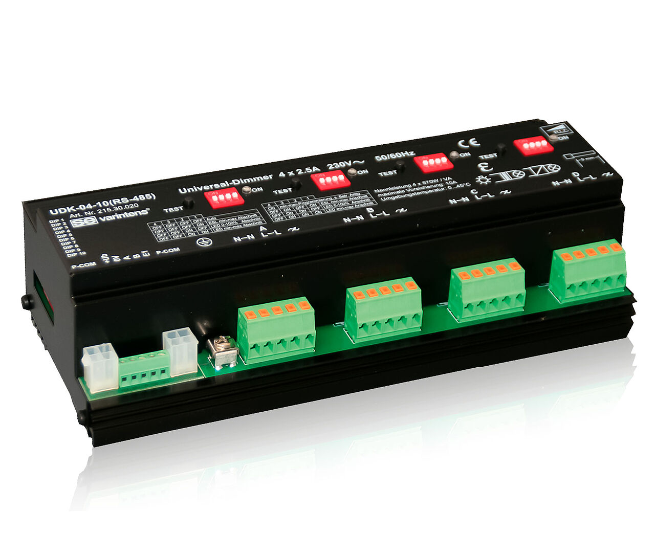 The UDK-04-10 (RS-485) is a robust dimmer in leading edge and trailing edge technology. On the one hand it can be controlled by different types and on the other hand it can also control different loads: