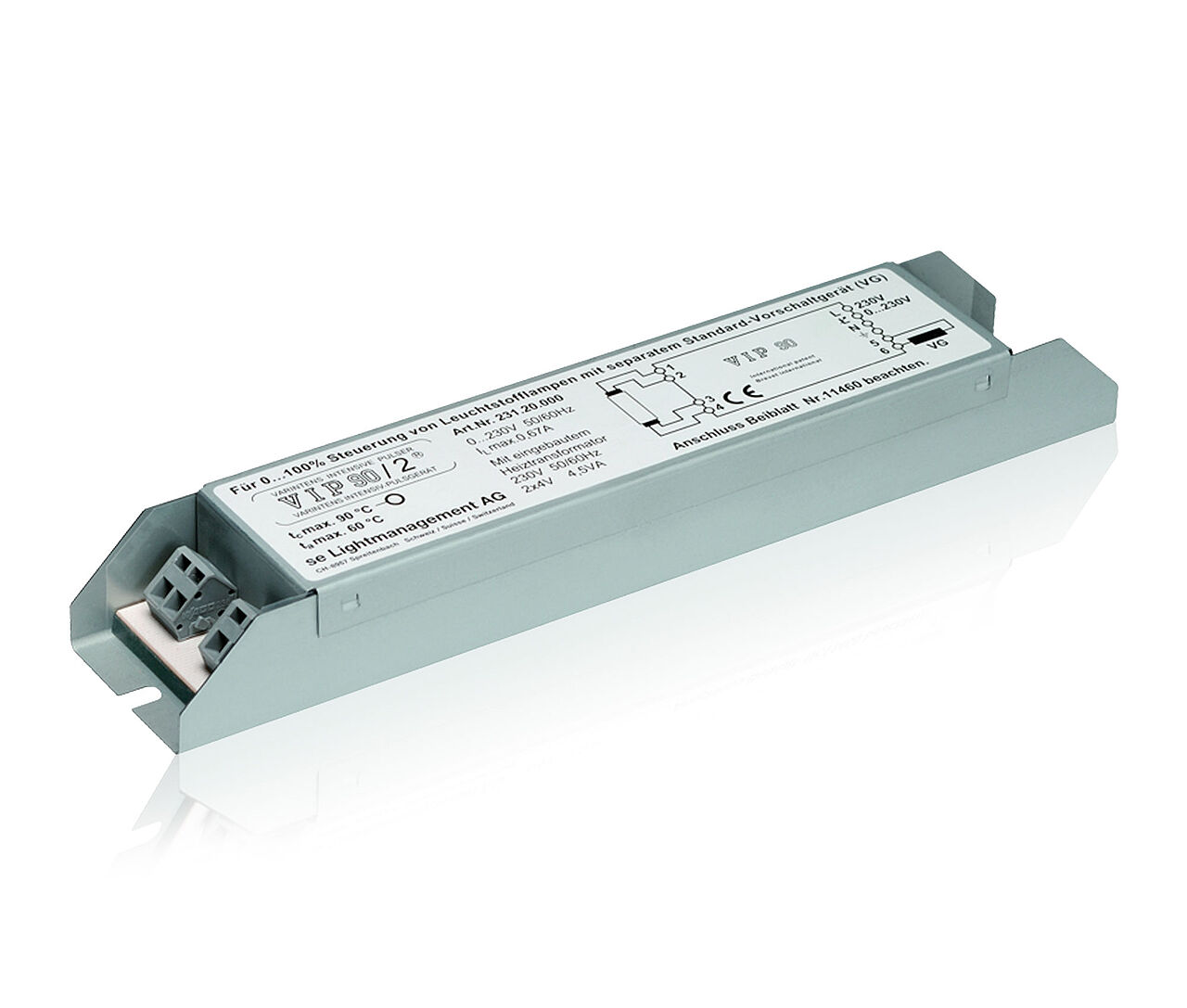 The VIP-90/2 L ballast is suitable for 0 to 100% control of fluorescent lamps and compact fluorescent lamps with separate standard ballast.