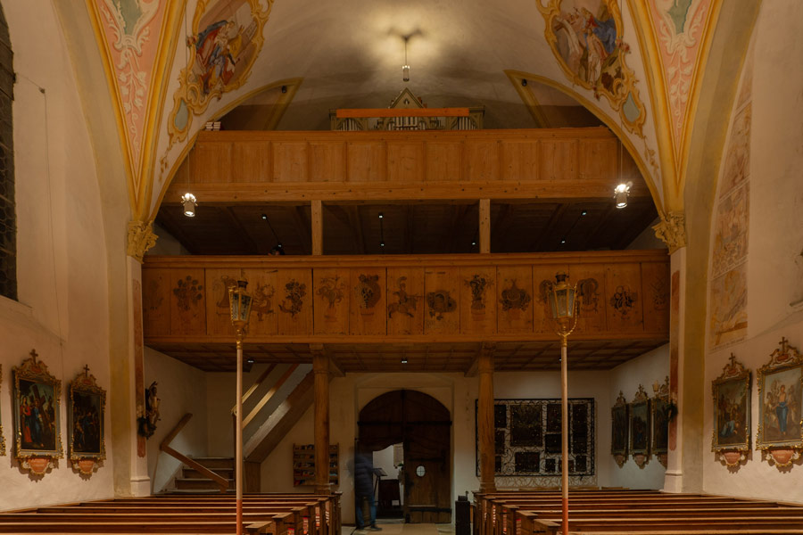 The main altar in rococo style contains a late Gothic image of the Virgin Mary and figures of St. Catherine and St. Apollonia. The two side altars depict the Holy Family and St. Sylvester. Passion paintings from the 16th century were uncovered in 1960.