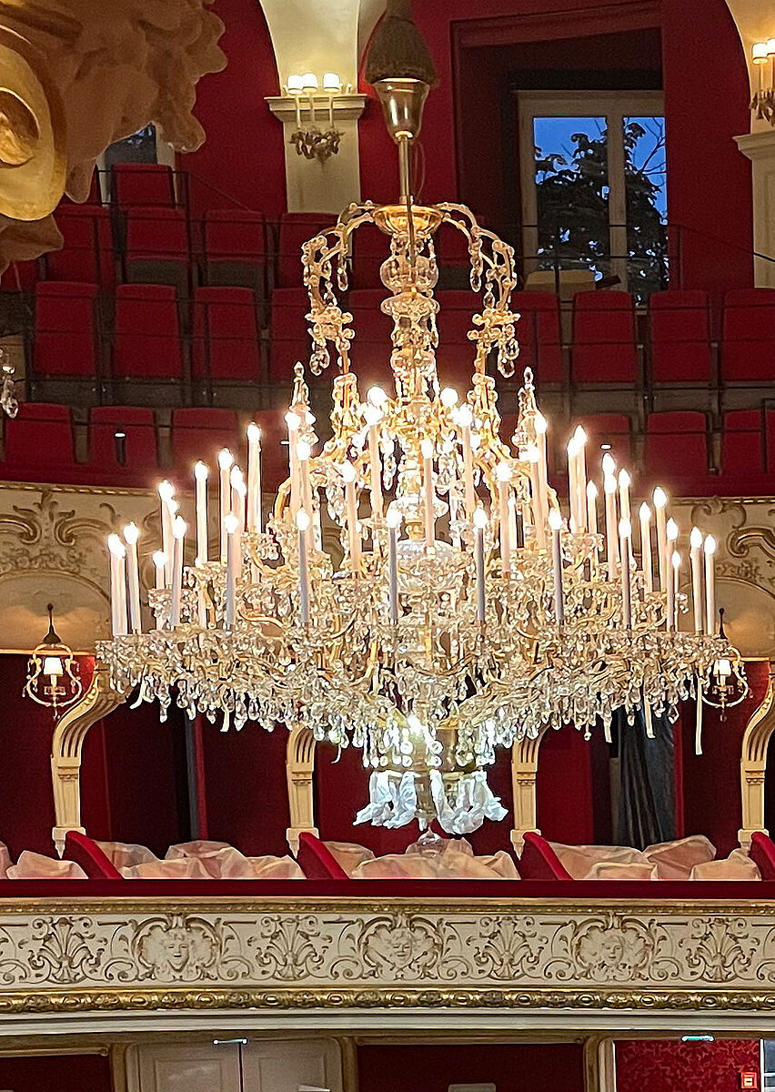 The historic chandelier (restored by a specialised company) was given a new suspension and can now be raised and lowered to great effect even before and during performances. The 60 retrofit/E14 candle bulbs can be controlled by the ISYGLT universal dimmer UD-700-X2, the integrated 72 mini-spots by the LED-04B-ANA-DMX dimmer. 48 spots are directed downwards to illuminate the auditorium, and 24 mini-spots are adjusted upwards to perfectly set the scene for the historic ceiling painting.