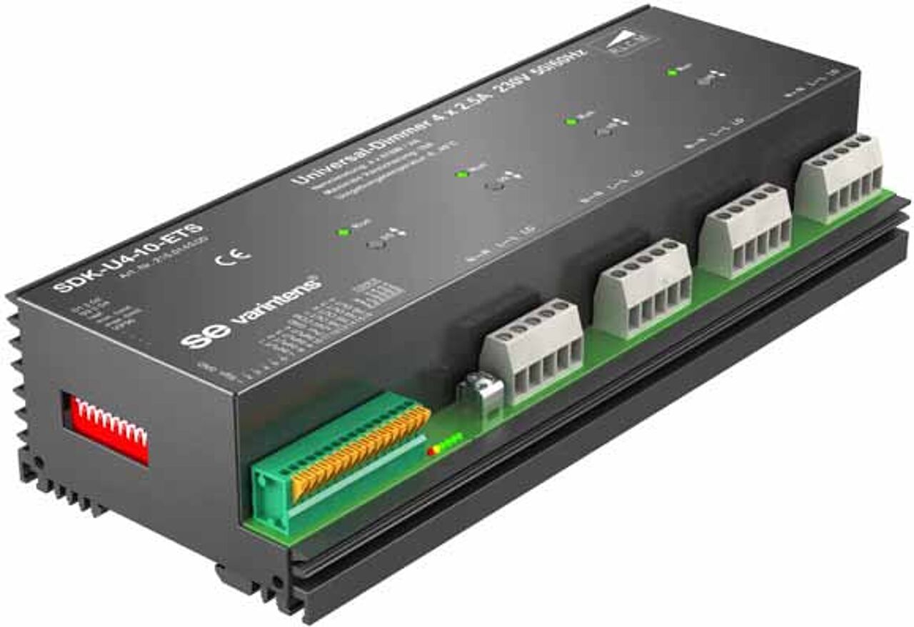 Der SDK-U4-10 (ETS) ist ein robuster Dimmer in Phasenanschnitt- und Phasenabschnitt-Technik. Er kann einerseits durch verschiedene Arten angesteuert werden und andererseits auch verschiedenste Lasten regeln: