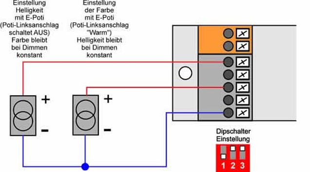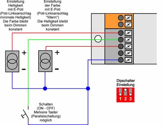 Mit dem ersten Poti wird die Helligkeit der Leuchtmittel eingestellt. Beim Dimmen bleibt die Lichtfarbe konstant. Das zweite Poti steuert die Lichtfarbe, beim Verändern bleibt die Helligkeit konstant.