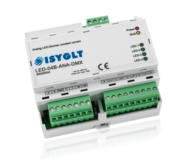 Der non-PWM LED-Dimmer wurde zur absolut flimmer- und flackerfreien Dimmung von konstantstromgesteuerten LEDs bzw. LED-Leuchten entwickelt. Der Dimmer arbeitet absolut ohne Pulsweitenmodulation und ist ein vollständig analoger Dimmer, der den gesamten Dimmbereich von 0% bis 100% kontinuierlich abdeckt. Im Gegensatz zu vielen anderen LED-Dimmern (Treibern), die im unteren Bereich auf Pulsweitenmodulation umschalten, arbeitet dieser Dimmer durchgehend analog. Es ist möglich, die Leuchtdioden bei einer Dimmauflösung von 16 Bit (interne Auflösung bei ISYGLT-Betrieb) in der Helligkeit zwischen 0% und 100% perfekt zu steuern. Der LED-Dimmer kann durch Parametrierung pro Kanal von Geschwindigkeitsberechnung auf absolute Zeitberechnung gesetzt werden. Hiermit sind alle erdenklichen Steuerungsaufgaben einfach realisierbar: Vom einzelnen Lichtdimmen bis hin zur Verwendung für aufwändige Licht- und Farbszenarien.