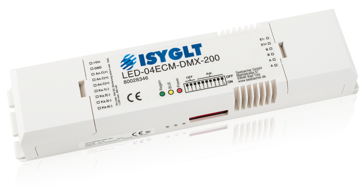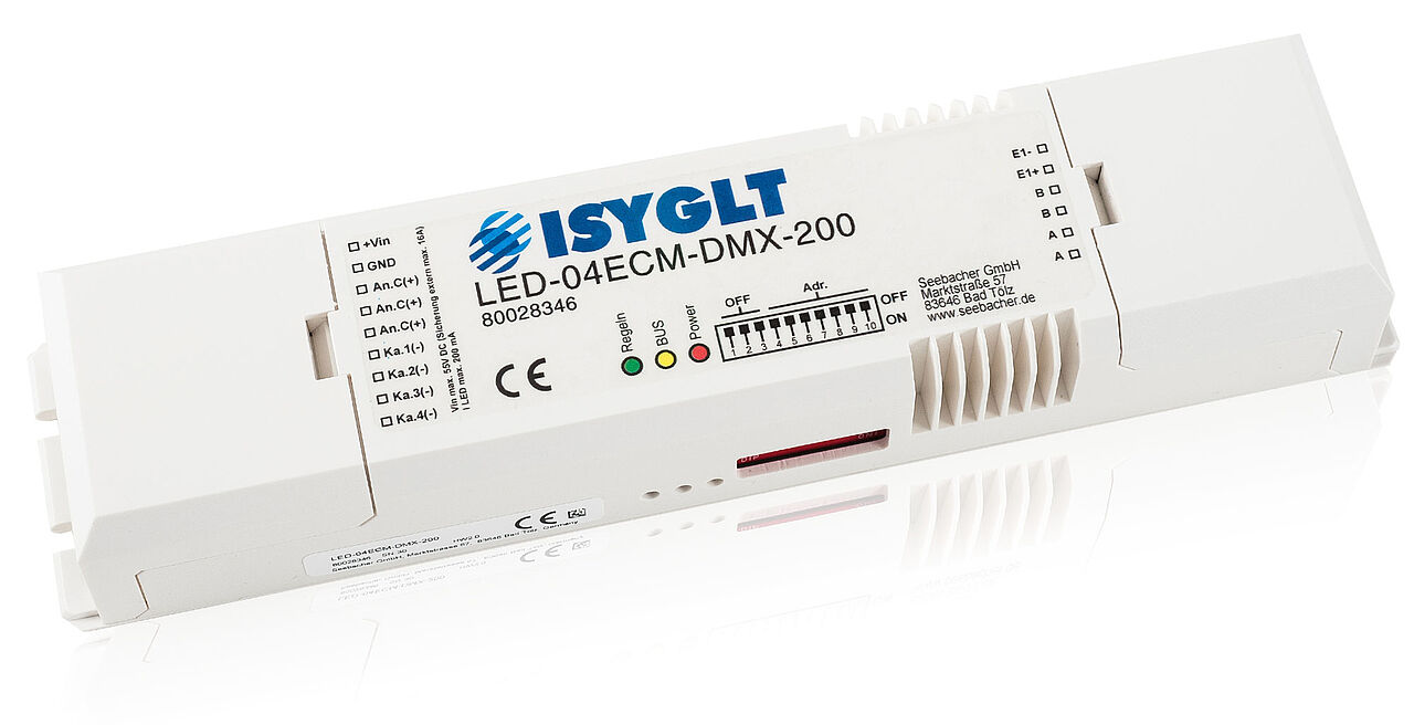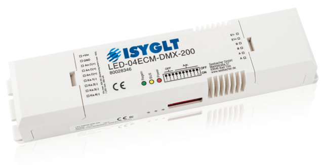 Der LED-04ECM-DMX-200 kann wahlweise am ISYGLT-BUS oder DMX512-BUS betrieben werden.
