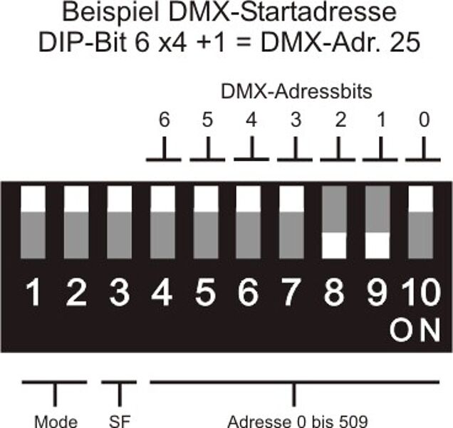 Mit den DIP-Schaltern 4 bis 10 wird die DMX-Adresse festgelegt. Die eingestellte Adresse, multipliziert mit 4 und addiert mit 1, entspricht der ersten von 4 aufeinander folgenden DMX-Adressen.