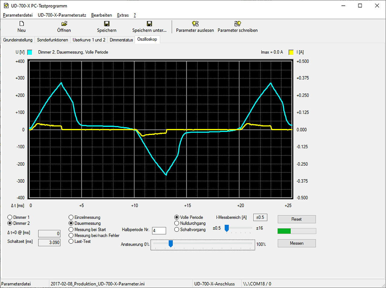 Für ISYGLT-Anwender ist das Parametrieren der Funktionen wie gewohnt im ProgrammDesigner möglich. Für Standalone- bzw. DMX-Anwender steht ein kostenloses Software-Tool zur Verfügung. Hiermit kann per USB- oder RS-485-Datenverbindung der Dimmer per Parameter optimiert und interne Daten wie Temperaturen, Spannungen Spitzenströme und Leistungen angezeigt werden. Zusätzlich ist als Neuheit auch eine Oszilloskop-Funktion integriert. Damit steht erstmals auch dem Anwender ein Hilfsmittel zur Darstellung der aktuellen Last zur Verfügung - und das ohne gefährliche Messungen an der Netzspannung!