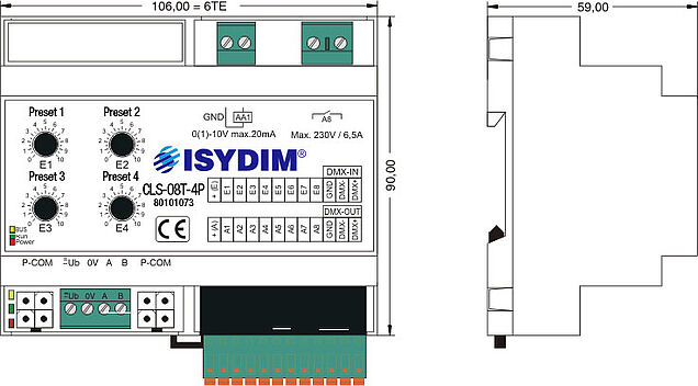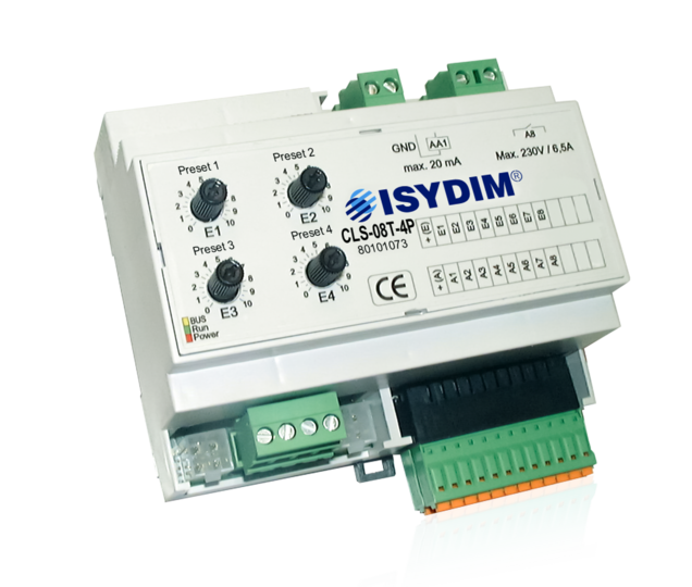 Der CLS-08T-4P ist eine Komfortlösung für Beleuchtungssteuerungen mit genormter 0(1)-10V-Schnittstelle für Source- und Sinkbetrieb. Die Schnittstelle ist mit 20mA belastbar und dient zum direkten Anschluss von dimmbaren Leuchtstofflampen mit EVG 1-10V oder NV-Halogenlampen mit 1-10V Trafo. Zum Analog-Ausgang ist auch ein Hybrid-Relais-Schaltausgang mit einer Belastbarkeit von 230V, 1500VA, 6,5A vorhanden. Dieser ist durch eine spezielle Schaltung im Nulldurchgang für EVG-Lasten optimiert und garantiert eine sichere Netzschaltung zur Dimmung. Durch die Verwendung von zusätzlichen Leistungsdimmern sind die unterschiedlichsten Anwendungen und Leistungsklassen realisierbar. Basis des Steuergerätes ist eine digitale, zukunftsweisende Multiprozessortechnologie, die einfach zu bedienende Funktionen und einen äußerst sicheren Betrieb garantiert.