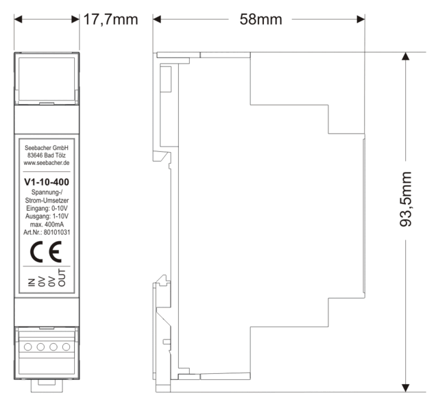 Der Sinkstrom-Konverter (Spannungs-/Stromumsetzer) V1-10-400 wurde entwickelt, damit 1-10V-steuerbare EVGs auch mit einer Fremdsteuerspannung von 0-10V angesteuert werden können (max. 700m Leitungslänge). Er kann einen EVG-Sinkstrom bis max. 400mA aufnehmen.