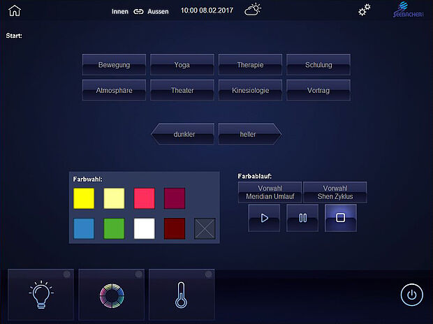 Die Lichtstimmungen sind unter anderem für die speziellen Anforderungen von sportkinesiologischen Übungen eingestellt. Dabei unterstützen die voreingestellten Farbabläufe „Meridianumlauf“ und „Shen Zyklus“ das Training. Das Farblicht übernimmt bei bestimmten Übungen unterstützende und auf unser Tiefenbewusstsein wirkende Aufgaben. Dadurch können Aktivität, Entspannung und die gezielte Unterstützung einzelner Körpersysteme beeinflusst und gefördert werden. Die vielfältige Nutzung des Raumes wurde in Einklang mit einer einfachen Bedienung gebracht. Auf der Startseite einer modernen Touch-Bedienstelle sind die wichtigsten Funktionen. Detailfunktionen sind auf untergeordneten Ebenen sowie administrative Einstellungen in der passwortgeschützten Profi-Einstellung angeordnet, um eine einfache und intuitive Bedienung zu gewährleisten.