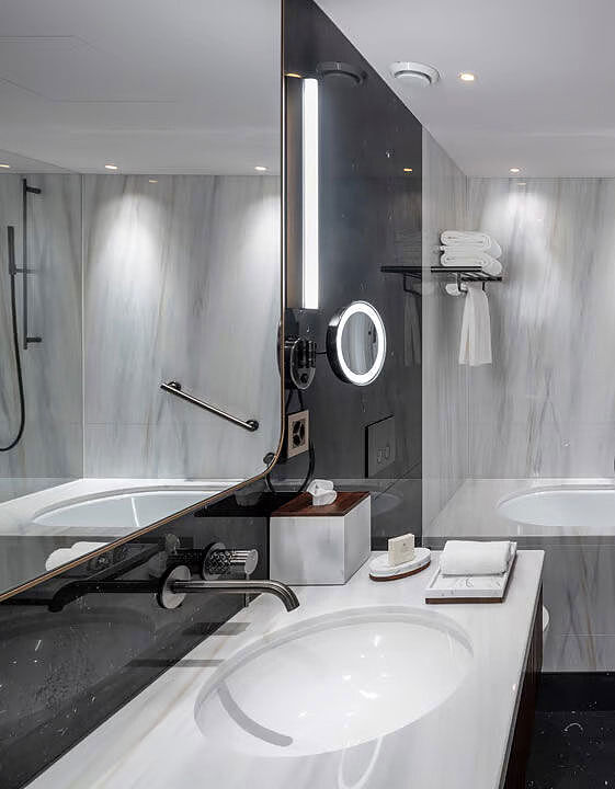Mit der Funktion „Zentral Aus“ schalten die Gäste die gesamte Beleuchtung bequem ab. Die Bedienelemente geben farblich abgesetzte Rückmeldungen zur nächst empfohlenen Szene – basierend auf der aktuellen Einstellung. Für größtmögliche Nutzerfreundlichkeit befinden sich die Taster strategisch an wichtigen Stellen: am Zimmer-Eingang, an beiden Seiten des Bettes, am Schreibtisch sowie im Badezimmer und WC.