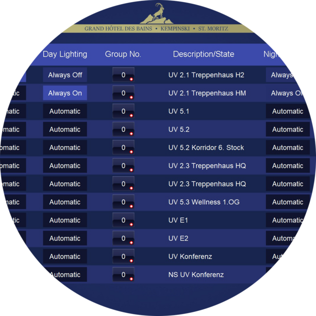 Ferner steuern wir die Beleuchtung im Innenbereich (Eingangshalle, Bar, Enoteca sowie zwei weitere Restaurants, Flure und Treppenhäuser), die Dachbeleuchtung und die gesamte Außenbeleuchtung mit Parkterrain, Brunnen, Flaggen, Wegen, etc.