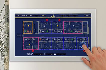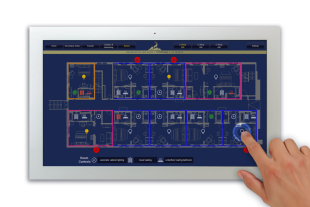• Darüber hinaus lassen sich die Hotelzimmer etagenweise in Form einer Grundrissvisualisierung einzeln oder in Gruppen über einen Touch-PC steuern: wählbar sind hier beispielsweise Voreinstellungen für Heizung, Fußbodenheizung oder Handtuchtrockner. Hier wurde besonders auf die intuitiv-logische Bedienbarkeit für das Technik-Personal geachtet.